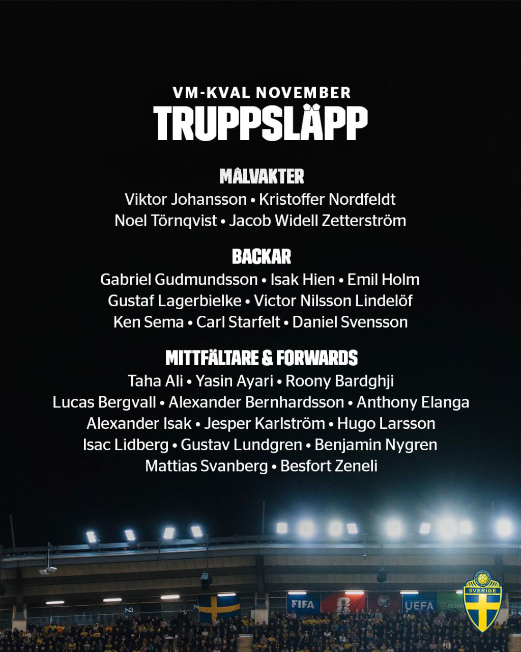 Tiền vệ: Bejrivar (Tottenham), Yashin Ah Yari (Brighton), Hugo Larsson (Eintracht Frankfurt), Svanberg (Wolfsburg), Karlström (Udinese), Zenelli (Efsburg), Lundgren (Gothenburg)