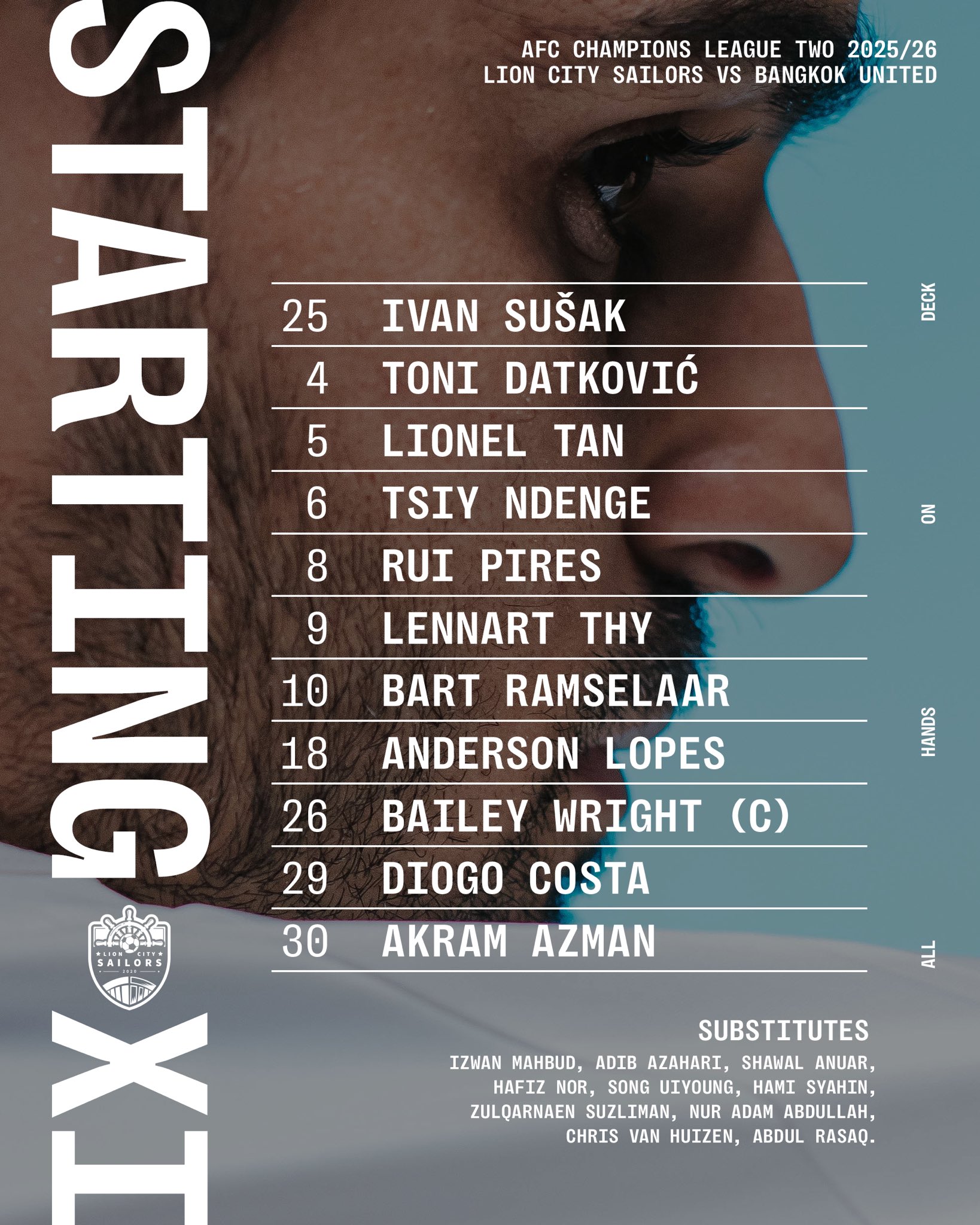 Đội hình xuất phát của Lion City Mariners:25-Susak, 26-Wright, 4-Datkovic, 5-Chen Hanwei, 29-Costa, 9-Tee, 10-Ramcelal, 6-Ndenger, 8-Pires, 30-Azman, 18-Lopez
