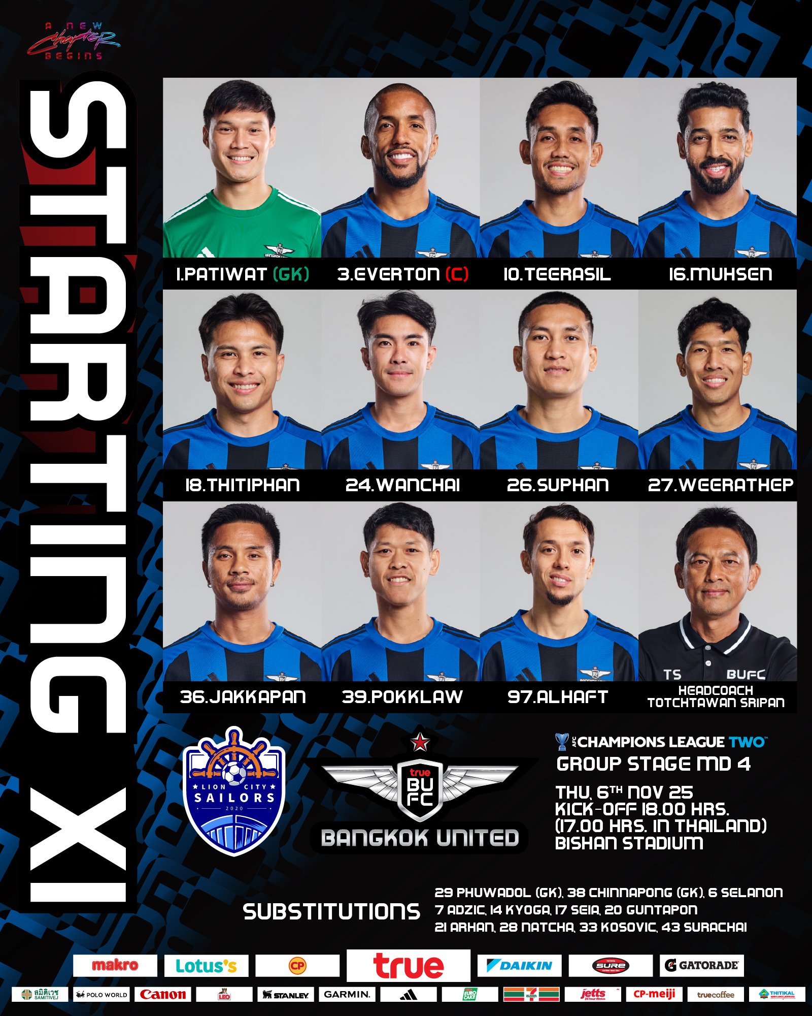Dự bị:38-Chinnaphorn, 29-Puhuatong, 6-Nitibon, 21-Arhan, 43-Surachai, 33-Kosovic, 14-Nakamura Jingya, 7-Azhi, 28-Nacha, 20-Gantabong, 17-Cửu Thành Shengya