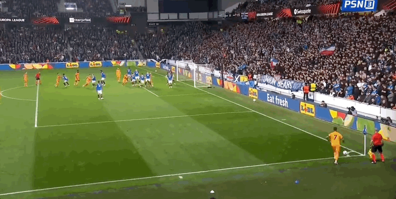 22' Sule tung cú sút từ bên ngoài, và thủ môn của Rangers đã cản phá được bóng từ vạch cuối sân