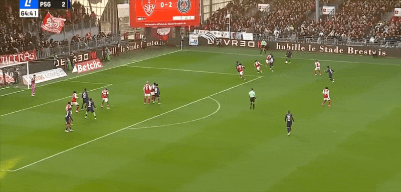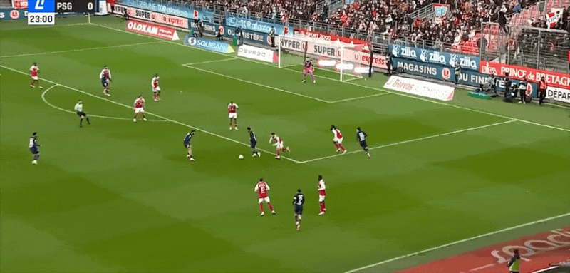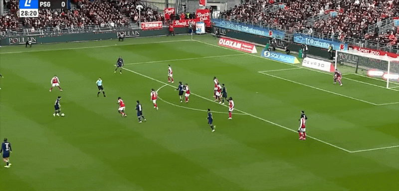 87' Brest phản công ở phần sân phía trước, Balde mất thăng bằng và sút trúng khung thành chỉ sau một cơ hội duy nhất.