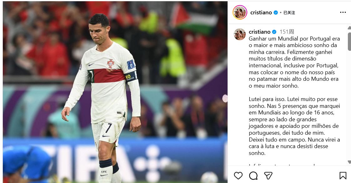 Tuy nhiên, quan điểm của Ronaldo sau World Cup 2022 ở Qatar rất khác so với bây giờ. Sau trận thua đau buồn của Bồ Đào Nha trước Maroc, Ronaldo đã đăng trên mạng xã hội rằng chức vô địch World Cup cho Bồ Đào Nha là giấc mơ lớn nhất trong sự nghiệp của anh và anh chưa bao giờ từ bỏ giấc mơ này.