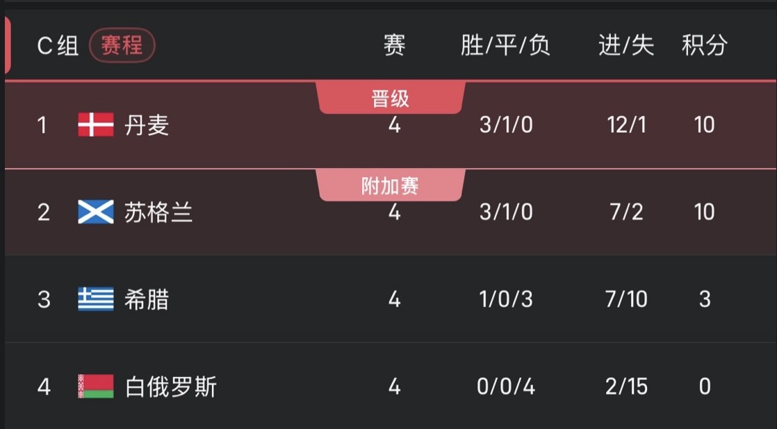 Đan Mạch và Scotland có cùng điểm. Hai đội sẽ thi đấu trực tiếp tại Glasgow ở vòng cuối cùng để tranh ngôi đầu bảng.