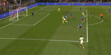 5'Harris vượt qua vạch cuối cùng của khu vực ba giây về phía sau và thủ môn nhấc bóng ra bằng một tay
