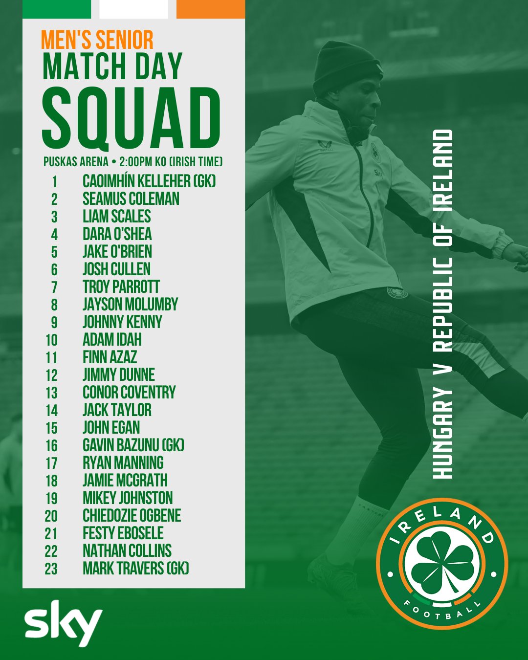 6686 Sports đưa tin ngày 16 tháng 11 rằng tối nay tại bảng F Vòng loại Châu Âu Thế giới, đội khách đến từ Ireland sẽ thách đấu Hungary. Trước trận đấu, mạng xã hội chính thức của đội tuyển Ireland đã công bố đội hình tham dự vòng này: