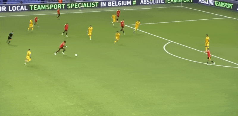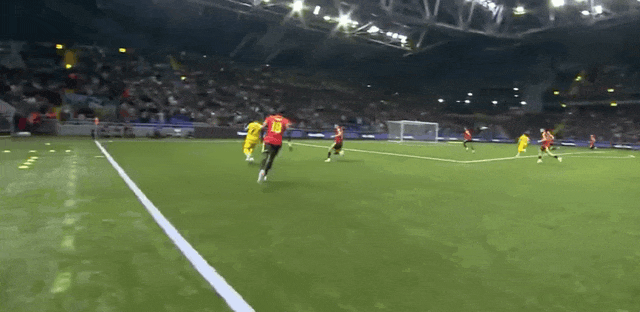 23' Castagne chuyền bóng vào vòng cấm, và cú vô lê cực mạnh của Trossard ở khu vực ba giây đã bị Anabekov cản phá