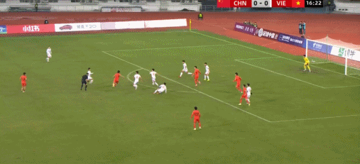 33' Đội tuyển Trung Quốc thực hiện đường chuyền uy hiếp từ cánh trái vào vòng cấm, cầu thủ chạy biên trước khung thành chậm hơn một bước