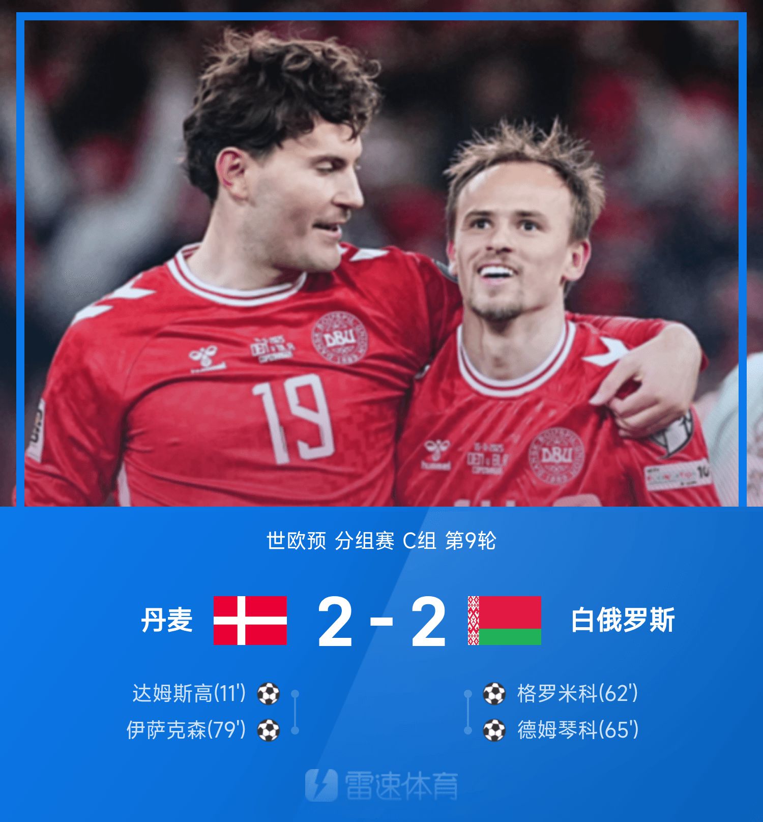 6686 Sports đưa tin ngày 16/11 rằng ở lượt 9 bảng C Vòng loại khu vực châu Âu lần thứ 26, Đan Mạch đối đầu với Belarus. Phút 11, Damsko tạo nên làn sóng siêu thế giới ngoài vòng 3 giây, Đan Mạch khởi đầu như mơ. Tình thế bất ngờ thay đổi trong hiệp hai. Belarus tận dụng đường chuyền và cú sút của Gromyko ở các phút 62 và 65, lập tức đảo ngược tỷ số thành 2-1. Phút 79, Dorgu chuyền bóng vào vòng cấm và Isaacson sút tung lưới. Hai đội lại quay về vạch xuất phát. Chung cuộc, Đan Mạch hòa Belarus 2-2 trên sân nhà. Do Scotland ở cùng bảng đấu thua Hy Lạp trên sân khách nên Đan Mạch vẫn chiếm thế lợi thế trực tiếp tiến vào vòng chung kết World Cup.