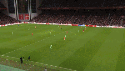 59' Hoibel vượt qua vòng cấm, Westergaard lắc đầu trong vòng ba giây nhỏ và sút cao khung thành