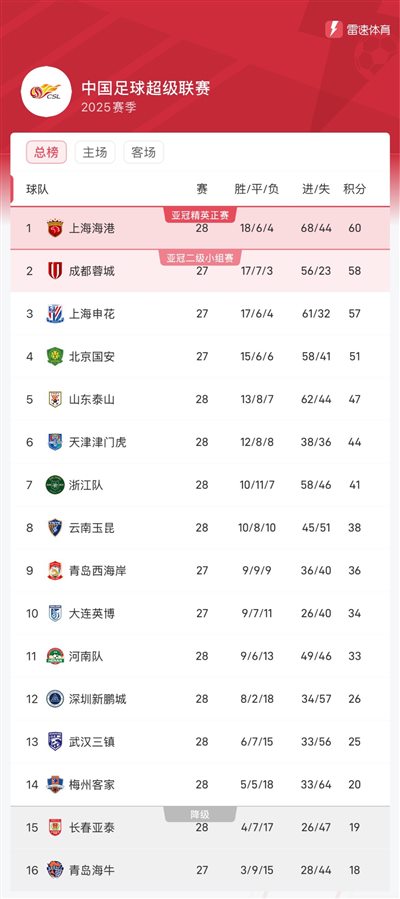 Điểm real-time Chinese Super League: Haigang dẫn trước 2 điểm, Thành Đô nếu thắng sẽ đứng đầu bảng, Shenhua tạm đứng thứ ba
