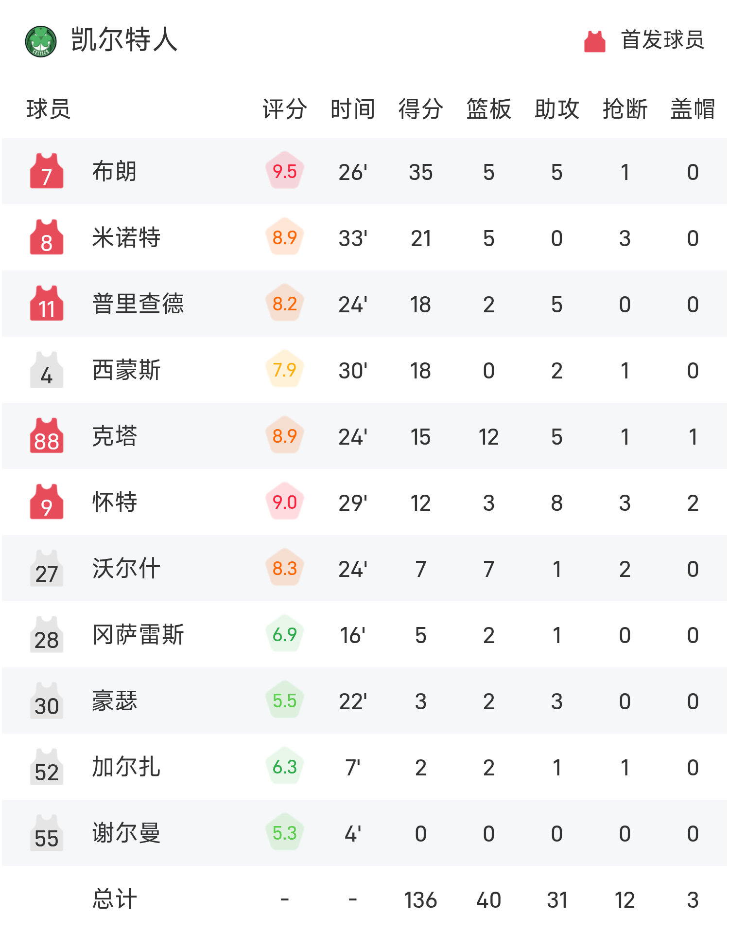 6686 Thể thao Tin tức ngày 06 tháng 11 Trong mùa giải NBA thường lệ 25/26, Celtics đối đầu với Wizards. Kết thúc trận đấu, Celtics đã đánh bại Wizards với tỷ số 136-107. Brown đã ghi được 35 điểm cao nhất trận, 5 rebound và 5 kiến tạo, đưa Celtics đến chiến thắng.