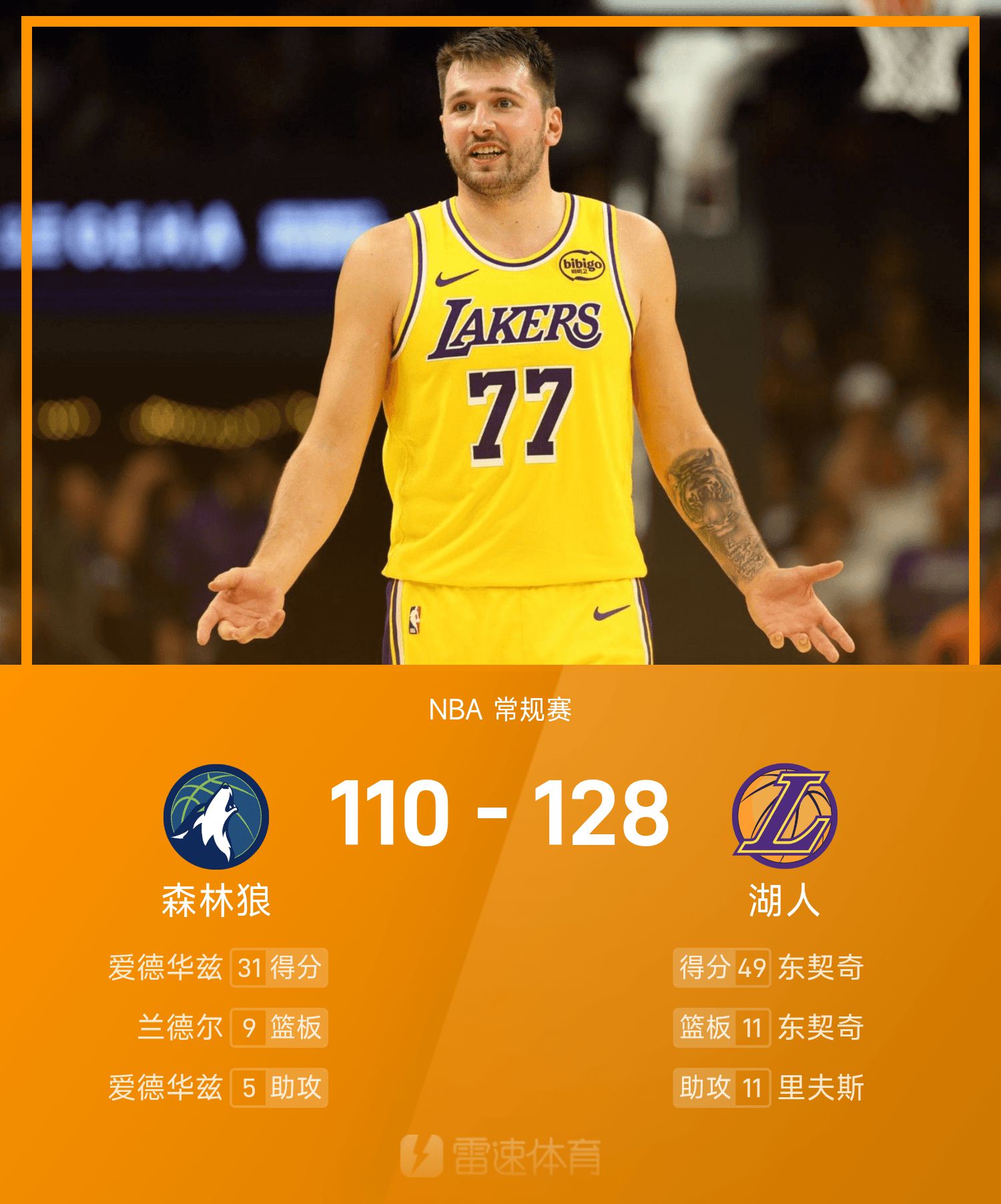 Báo cáo trận đấu NBA: Doncic 49 điểm, 11 rebound và 8 kiến tạo, Lakers đánh bại Timberwolves 128-110