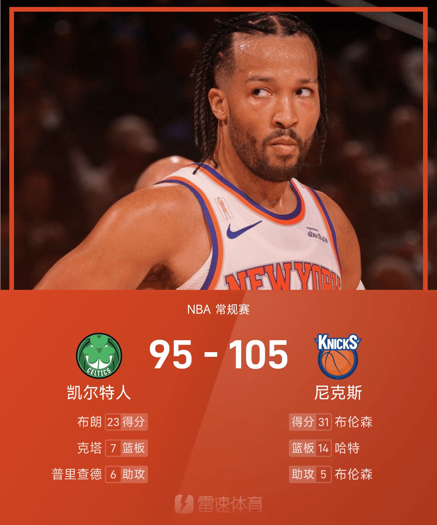 6686 Thể thao ngày 25 tháng 10 Trong mùa giải NBA thường lệ 25/26, Knicks đối đầu với Celtics. Kết thúc trận đấu, Knicks đánh bại Celtics với tỷ số 105-95. Brunson ghi được 31 điểm cao nhất trận, 3 rebound và 5 kiến tạo, đưa Knicks đến chiến thắng.