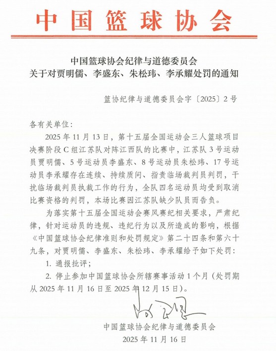 2. Đình chỉ tham gia các hoạt động thi đấu thuộc thẩm quyền của Hiệp hội Bóng rổ Trung Quốc trong 1 tháng (thời gian xử phạt từ ngày 16/11/2025 đến ngày 15/12/2025).