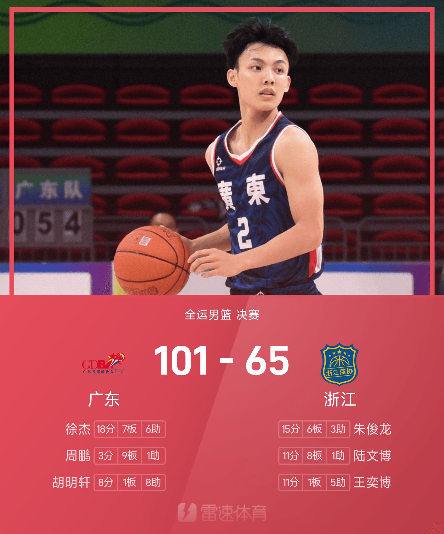 Xu Jie ghi được 18 điểm cao nhất trận, 7 rebound và 6 kiến tạo, trong khi Zhao Rui ghi 13 điểm, 4 rebound và 5 kiến tạo, đưa Quảng Đông giành chiến thắng và giành huy chương vàng bóng rổ nam tại Đại hội thể thao toàn quốc này.