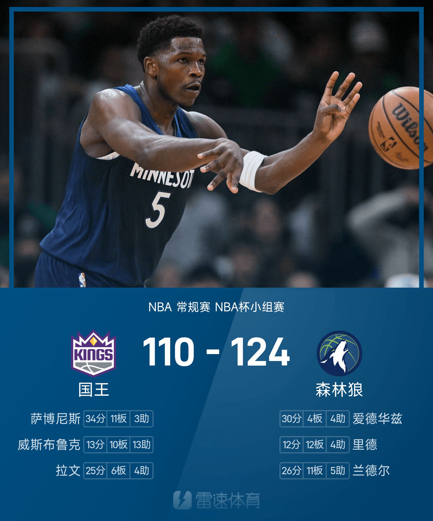 Sau khi hai bên giao chiến, Timberwolves đã đánh bại Kings với tỷ số 124-110.
